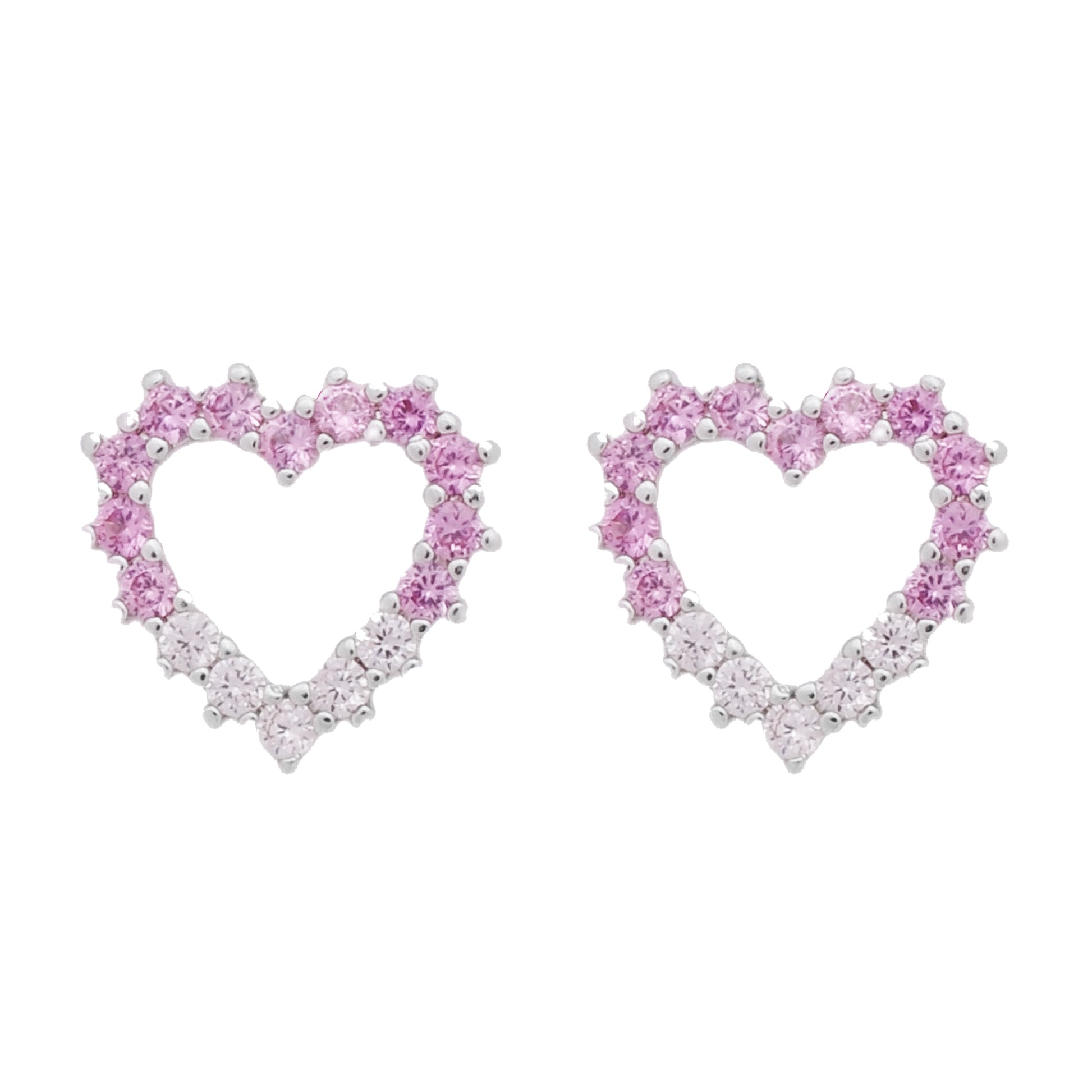 Conjunto Prateado de Coração Vazado Cravejado de Zircônia Rosa Dois Tons